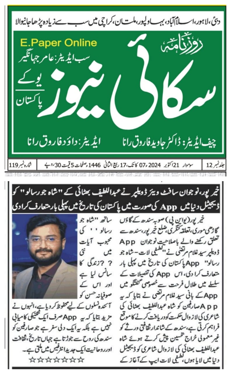 صوبہ سندھ کے گاؤں گاڑھی موری، تعلقہ کنگری، ضلع خیرپور، سندھ سے تعلق رکھنے والے باصلاحیت نوجوان App ڈویلپر سید غلام مرتضیٰ نے "لطیفی لات - شاہ جو رسالو" App پاکستان کی تاریخ میں پہلی بار متعارف کرا دی، سندھ کی تاریخی App کی تفصیلات کے سلسلے میں نمائندہ خصوصی طلال فرحت سے گفتگو میں App کے بانی سید غلام مرتضی نے بتایا کہ یہ App صارفین کو شاہ عبداللطیف بھٹائی کی شاعری کی لازوال حکمت کو دریافت کرنے کا موقع فراہم کرتی ہے، سندھ کے شاندار ثقافتی ورثے کو غیر معمولی خراج تحسین پیش کرتے ہوئے شاہ عبداللطیف بھٹائی کی لازوال شاعری کو 4 سال کی محنت کے بعد الحمدوللہ ڈیجیٹل دنیا میں لایا ہوں، بتاتا چلوں کہ لطیفی لات App کے آغاز کے ساتھ "شاہ جو رسالو" کی محبوب آیات میں نئی زندگی کا سانس لیا ہے اور اس کے صوفیانہ حسن کو آئندہ نسلوں کے لیے محفوظ کر دیا ہے، انہوں نے مزید بتایا کہ یہ App صرف ایک تکنیکی کامیابی نہیں ہے بلکہ یہ ایک دلی سفر ہے جو صارفین کو سندھ